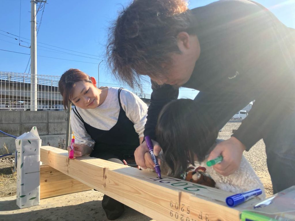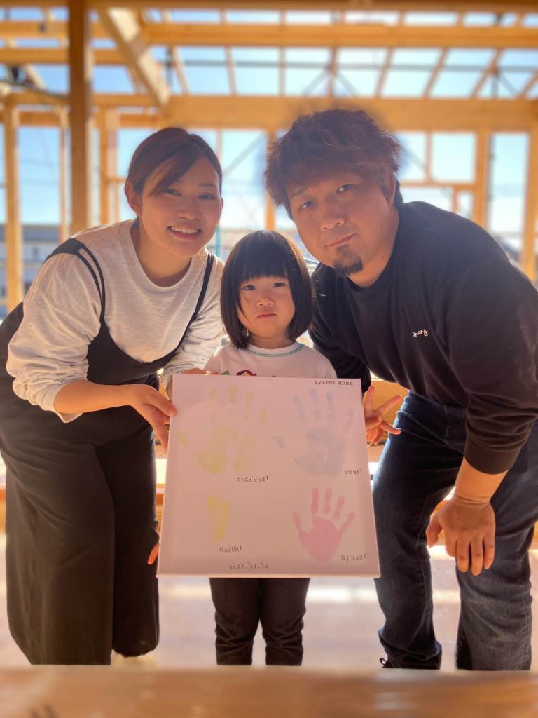 上棟前にご出産を経て、本日4人家族揃って手形アートの作成ができたのも、M様ご家族の絆があったからこそだと感じました。