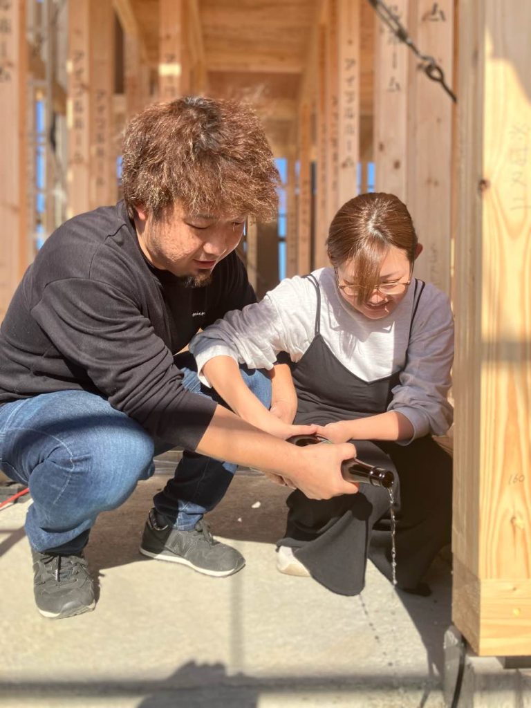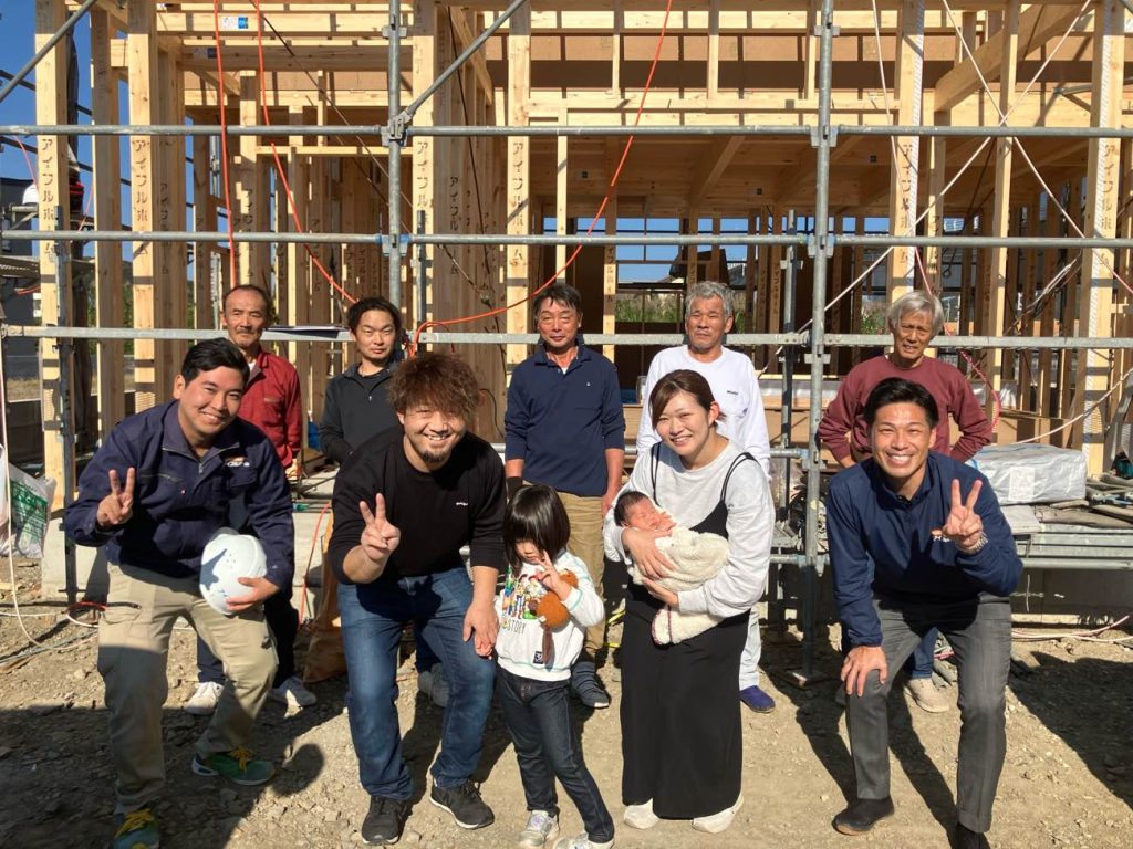 天候にも恵まれ、奥様も出産後にお子様を連れて上棟式に参加する事ができました。