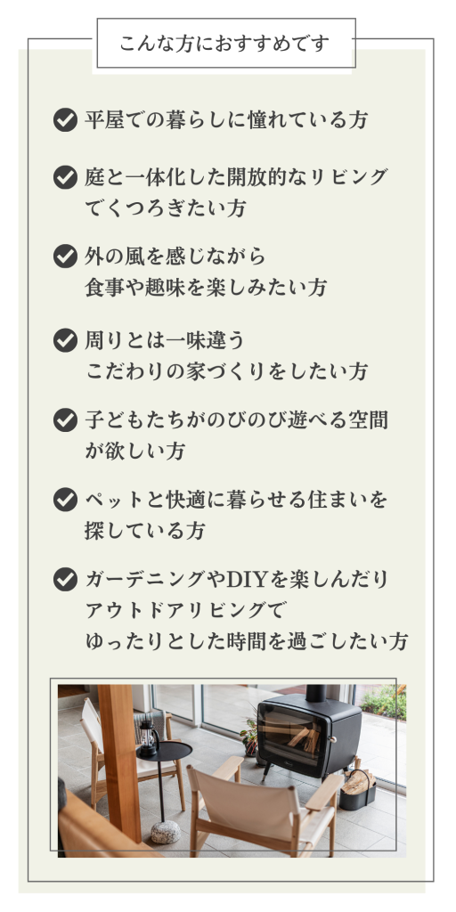 こだわりの平屋で、自然をもっと身近に感じながら暮らしたい。 そんな方のマイホームイメージがぐっと広がる見学会です。 「半屋外空間」の採光や広がりを体感し、具体的な暮らしをぜひこの機会に体験してみてください。