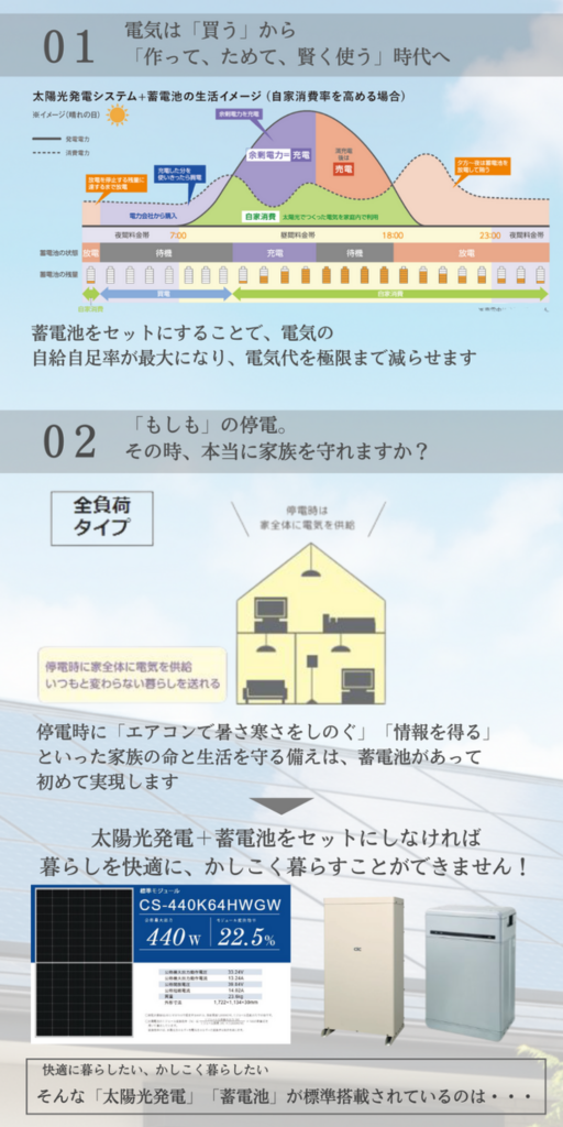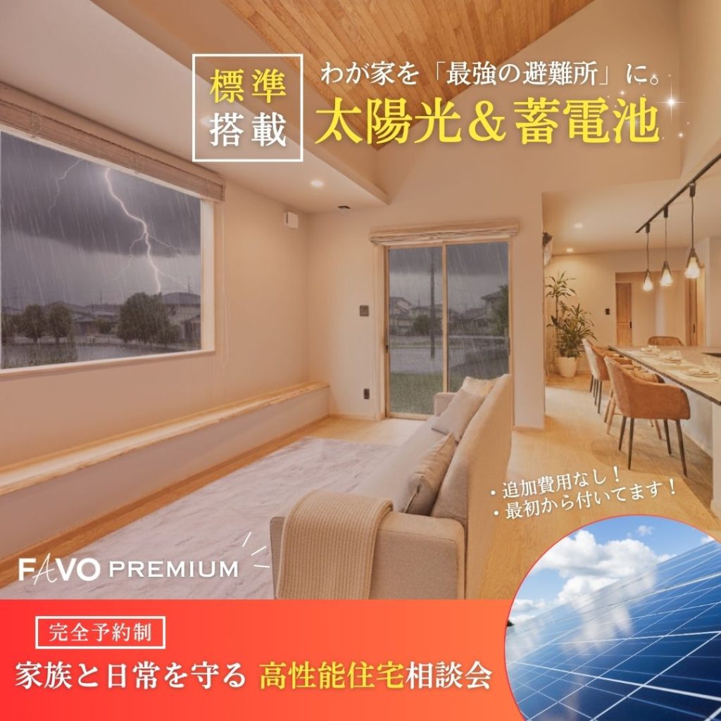 近年、電気代がどんどん上がって光熱費を抑えたい!という方 そして、、地震や水害などの自然災害への対策意識が強まっています。 万が一の災害で、停電になり日常生活が送れなくなる可能性もあります。 そんな万が一のときに、家族、お子様が自宅で安心して避難生活が送れるようにするために、太陽光と蓄電池を採用する方が増えています。 アイフルホームの新商品 FAVO PREMIUMでは、高額な太陽光と蓄電池が、標準搭載されているので、追加費用はかかりません! 他にもデザイン性、機能性、コスパに優れた厳選された各種設備が標準搭載されていますので、ぜひ、お気軽にご相談ください。