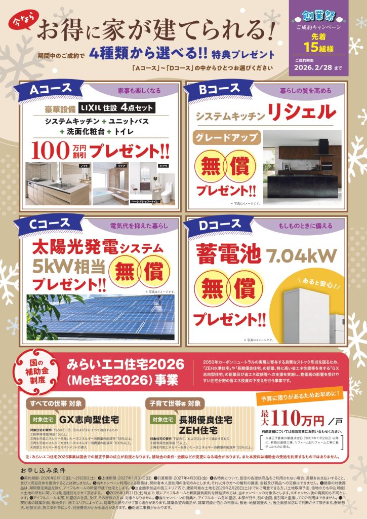 早期契約で先着15名様に選べる成約特典をプレゼント! ※詳細については担当営業にご質問ください。
