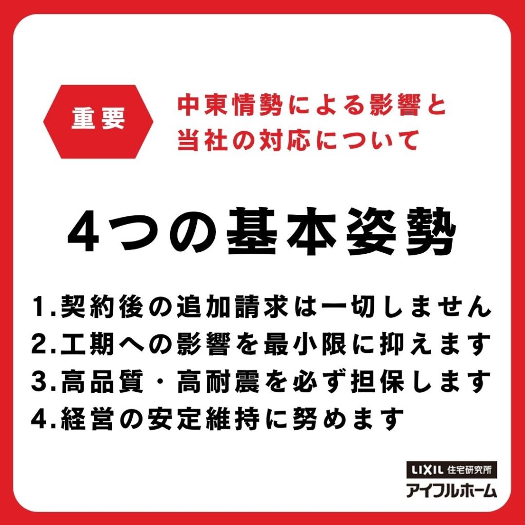 中東情勢の長期化に伴い、住宅設備の供給不安定や資材価格の高騰が懸念されています。 アイフルホーム徳島では、こうした状況下でも お客様に安心してお家づくりを進めていただけるよう、以下の4つの基本姿勢を徹底いたします。