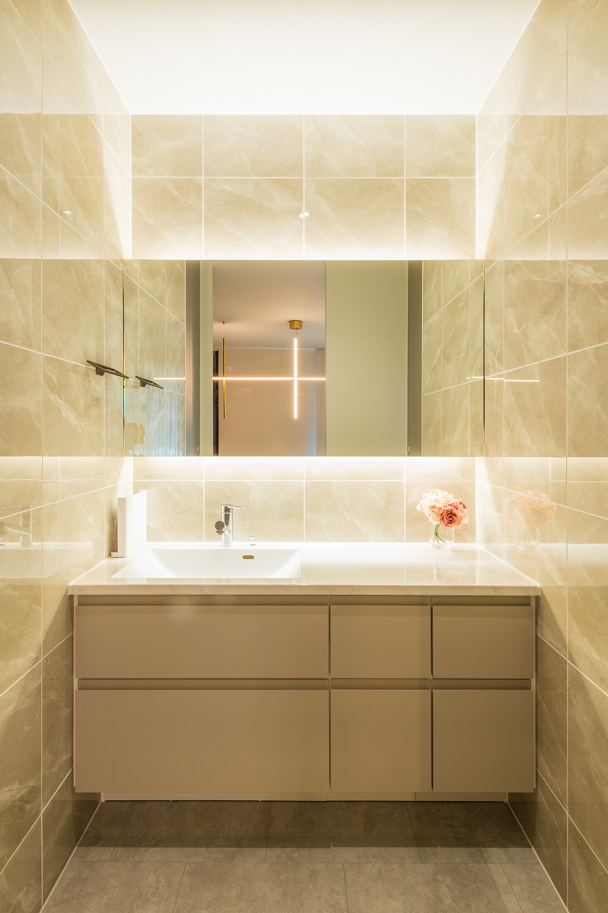 一面鏡の裏からさす間接照明が全面のタイルに反射して高級ホテルのような空間を演出。