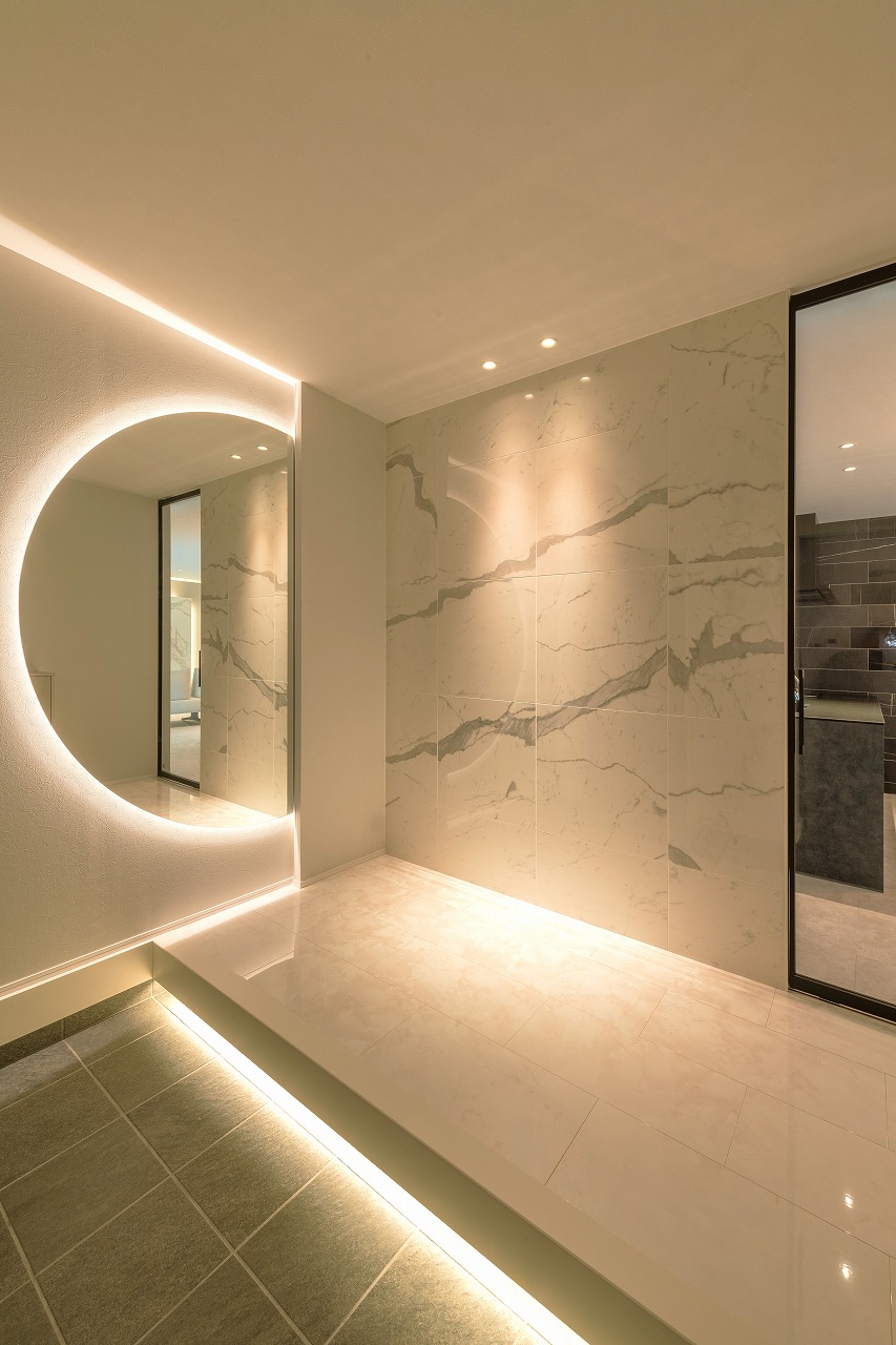 月をイメージした大鏡の間接照明は玄関入って圧巻の存在感。