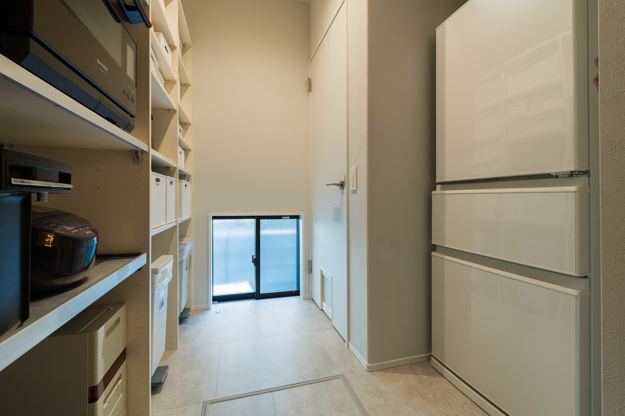 ペットのことも考えて猫用扉をつけたパントリーや壁のみに黒を使って重くなりすぎないようにした脱衣室など細かい工夫がたくさん散りばめられたお家に仕上がりました。