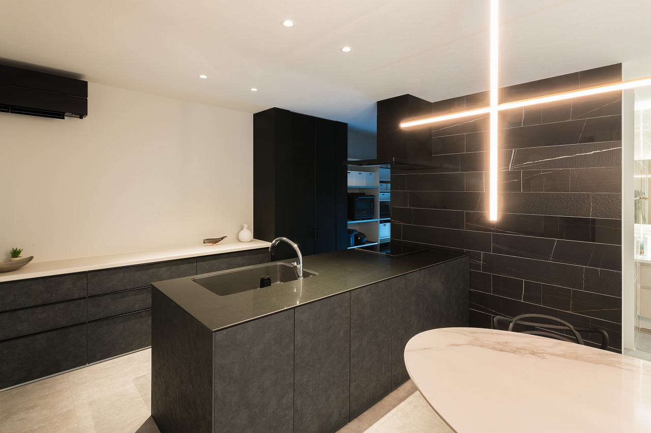 白で統一したリビングと対照的に、キッチンにはシンクや壁に黒を使った色のゾーニング。タイルも表面の仕上げが異なるものを混ぜて変化をつけました。洗面にも光沢のあるタイルを使用し、空間全体に光を反射して高級ホテルのような空間に。
