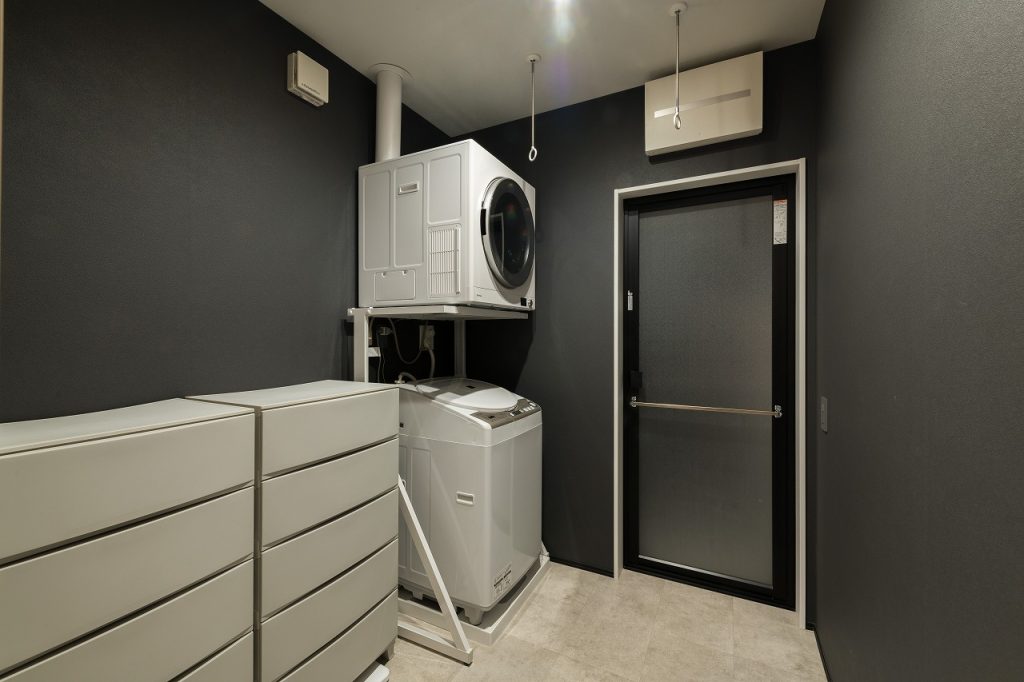 脱衣所は壁のみを黒にし、印象が重たくなりすぎるのを回避。