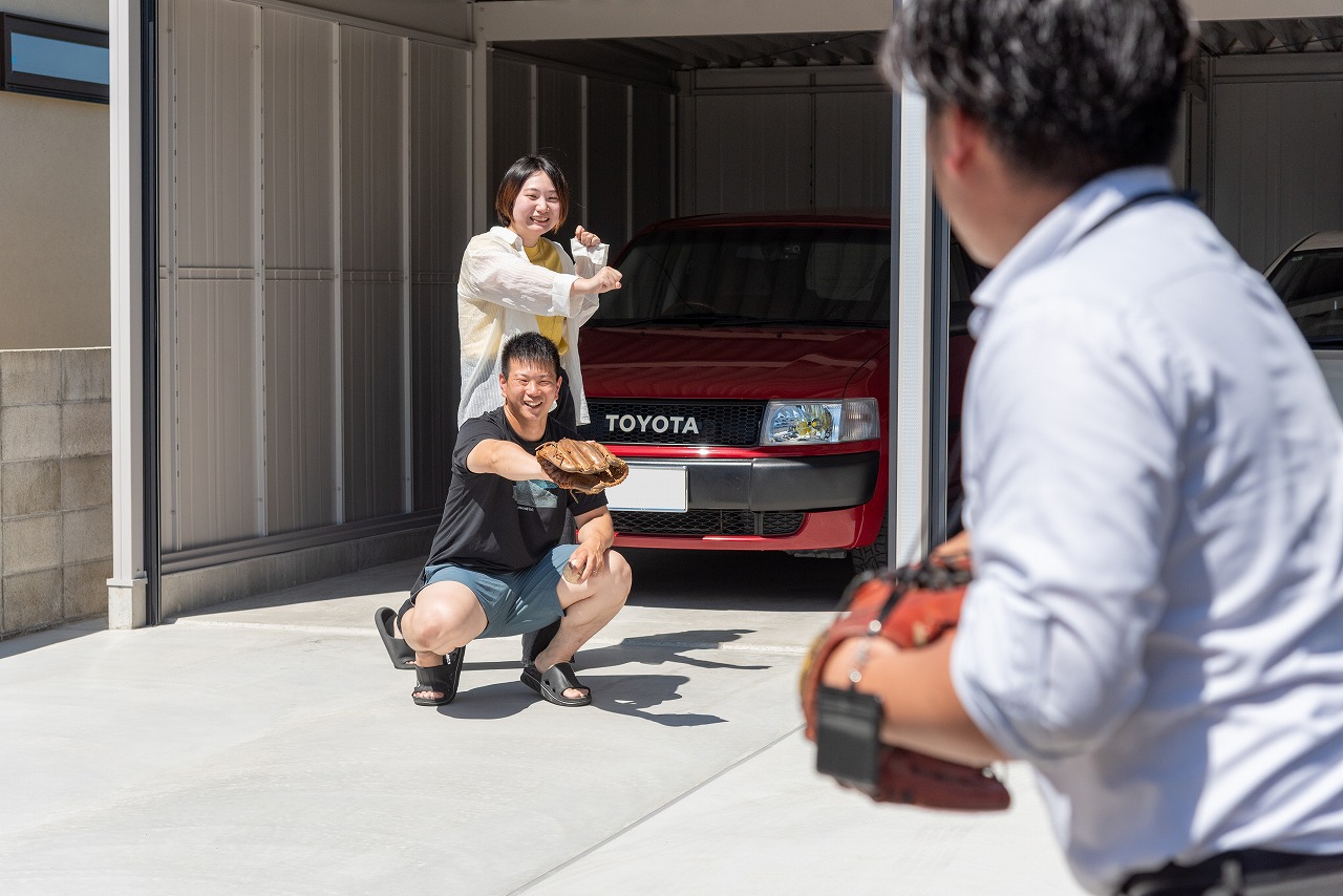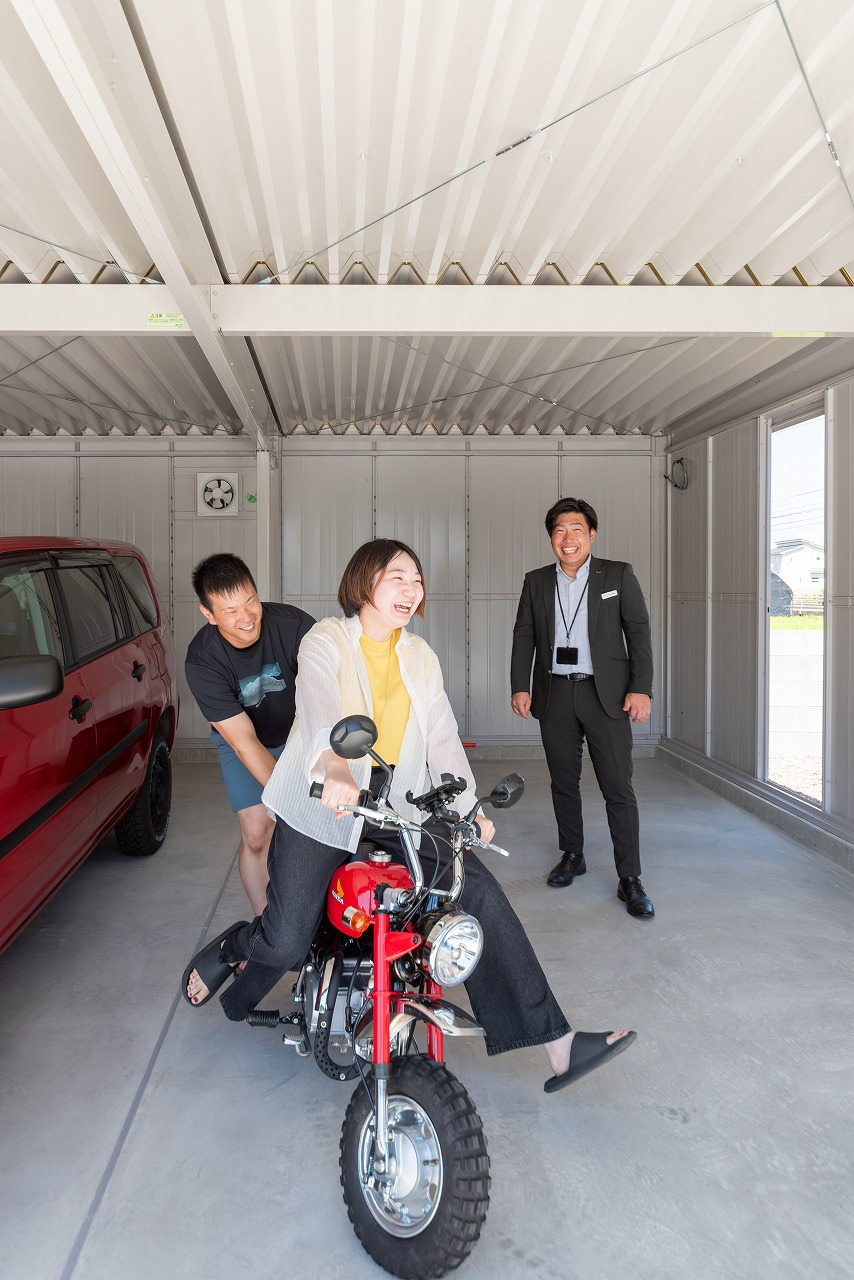奥行きの広いガレージにすれば後ろに物を置いたり、車を前に出してバーベキューもできると大きさにこだわりがあったお施主様。