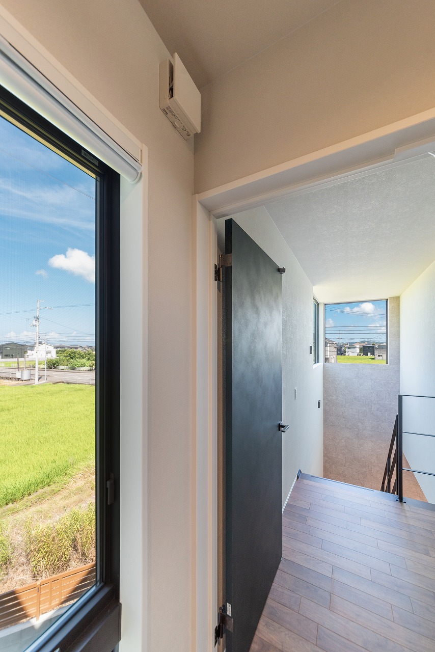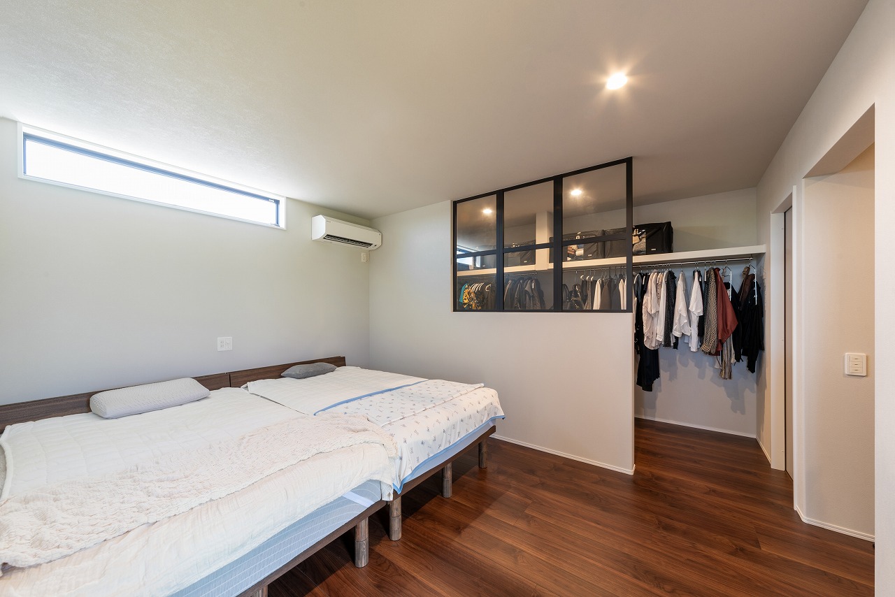 寝室に設けた室内窓、階段はシースルーに、リビングのドアは透明にするなど、空間を開放的に感じさせるアイデアを採用したこだわりたっぷりのお家に仕上がりました。