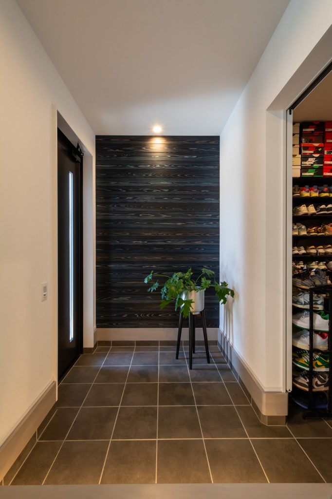 徳島の藍で染め上げた天然木を飾った玄関。シューズクロークは見えない位置にレイアウト。