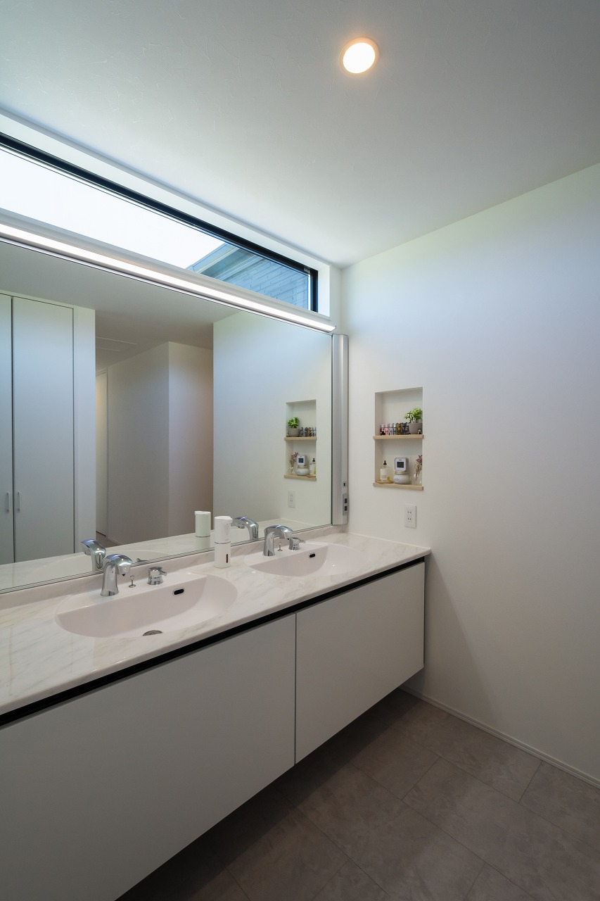 女の子2人が成長してもゆったり使えるようにと洗面台は2ボウル、トイレは2つ設置。