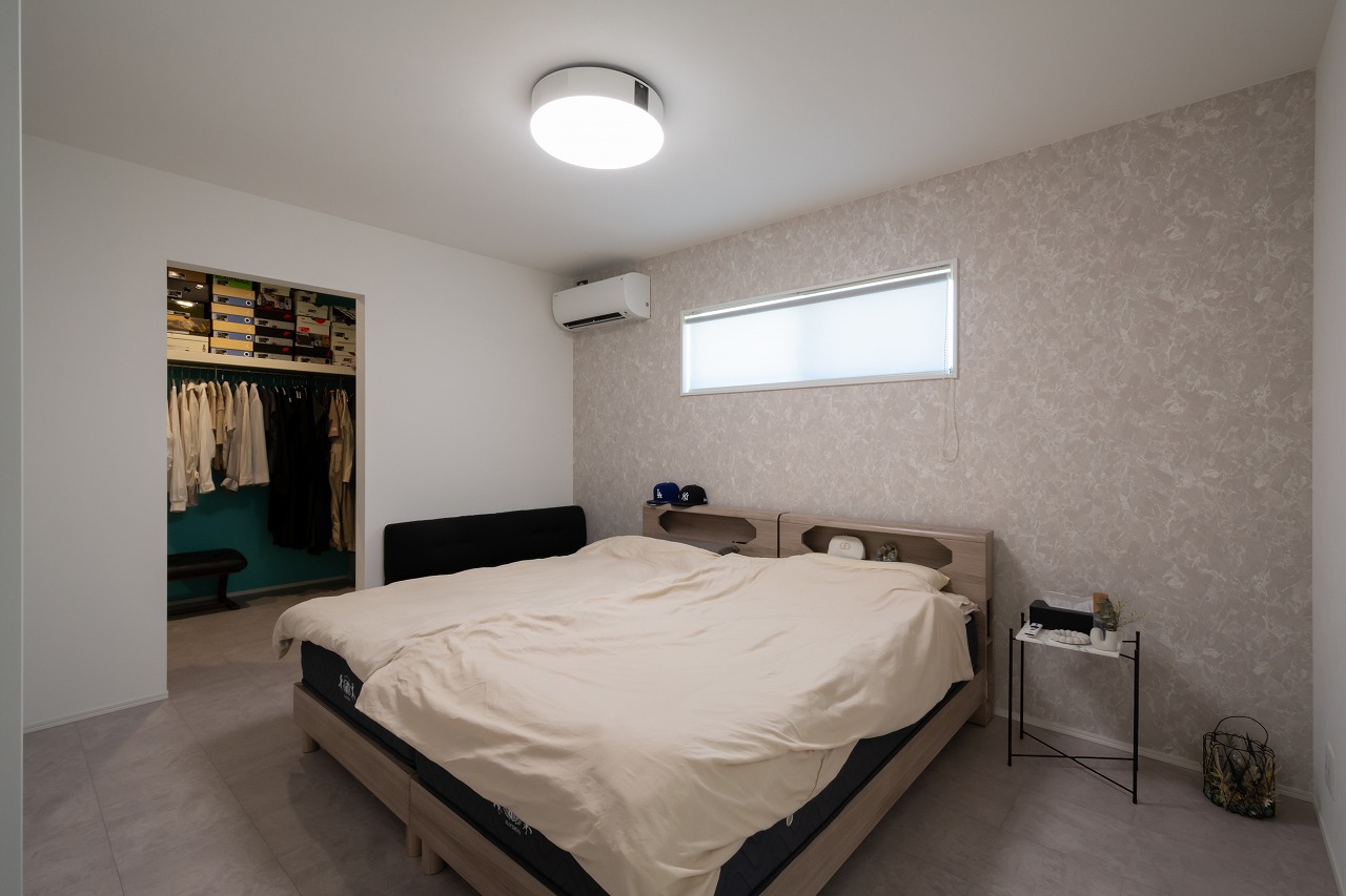 寝室奥に設置したオープンなクローゼットは、壁にターコイズブルーをあしらった。